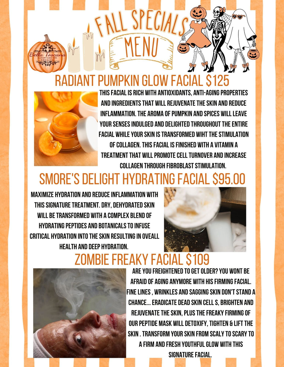 Radiant Pumpkin Glow Facial - $125.00 Embrace the magic of pumpkin with this antioxidant-rich facial! Rejuvenate your skin and senses with the delightful aroma of pumpkin and spices. Finish with a Vitamin A treatment for a radiant, youthful glow.